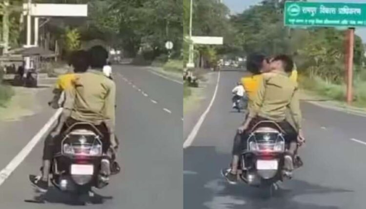 चलती स्कूटी पर पीछे बैठे दोनों लड़को ने लिया लिप लॉक