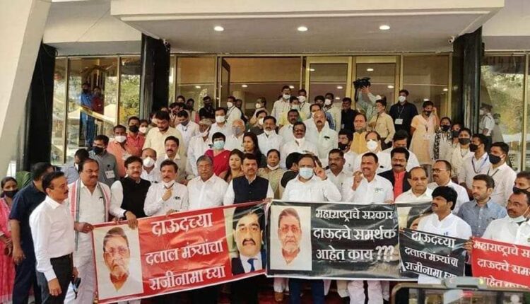 मुंबई – अर्थसंकल्पीय अधिवेशनाच्या पहिल्या दिवशी “नवाब मलिक कौन है…दाऊद का दलाल है…” अशा घोषणा देत आज भाजपच्या सर्व आमदारांनी विधानभवनाच्या पायऱ्यांवर आंदोलन करुन नवाब मलिक यांच्या राजिनाम्याची जोरदार मागणी केली आहे BJP demand for Nawab Malik resignation. नवाब मलिक यांच्यावर दाऊद इब्राहिम मनी लाँड्रिंग प्रकरणाशी संबंध असल्याचा आरोप असून याच प्रकरणात त्यांना अटक झाली आहे.