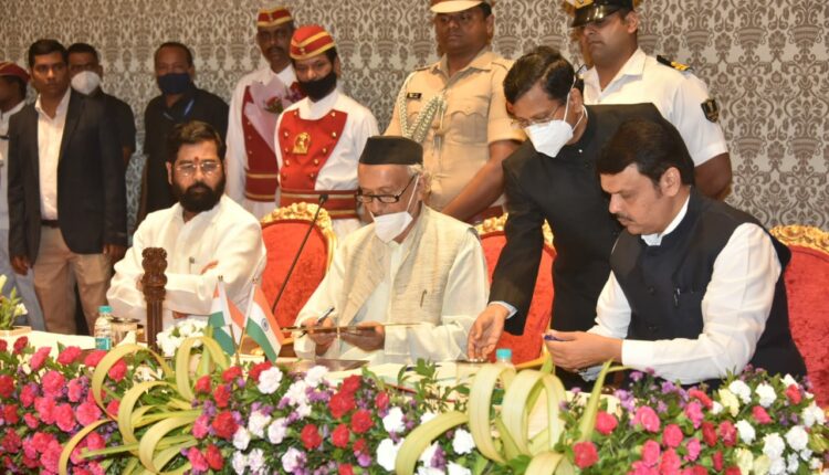मुंबई : श्री एकनाथ शिंदे Chief Minister Eknath Shinde यांनी आज राजभवन येथे झालेल्या समारंभात मुख्यमंत्रीपदाची शपथ घेतली. देवेंद्र फडणवीस Deputy Chief Minister Devendra Fadnavisयांनी यावेळी उपमुख्यमंत्री पदाची शपथ घेतली. राज्यपाल श्री भगत सिंह कोश्यारी यांनी मुख्यमंत्री व उपमुख्यमंत्री यांना पद व गोपनीयतेची शपथ दिली.
