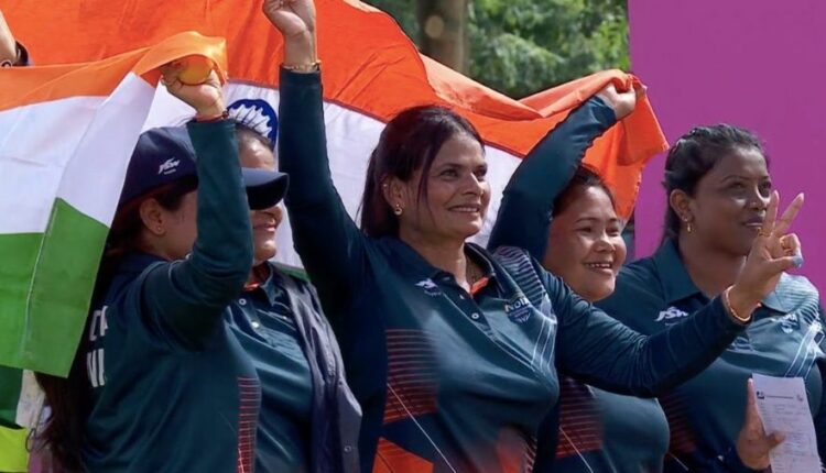 Team 🇮🇳 defeat 🇿🇦 17-10 in the Women’s Fours to clinch their first ever 🥇in Lawn Bowls at @birminghamcg22 .