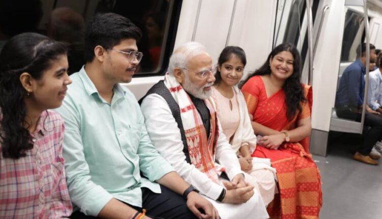 PM Shri @narendramodi interacts with passengers in Delhi Metro during his ride to Delhi University. pic.twitter.com/NHYZlSUrYb