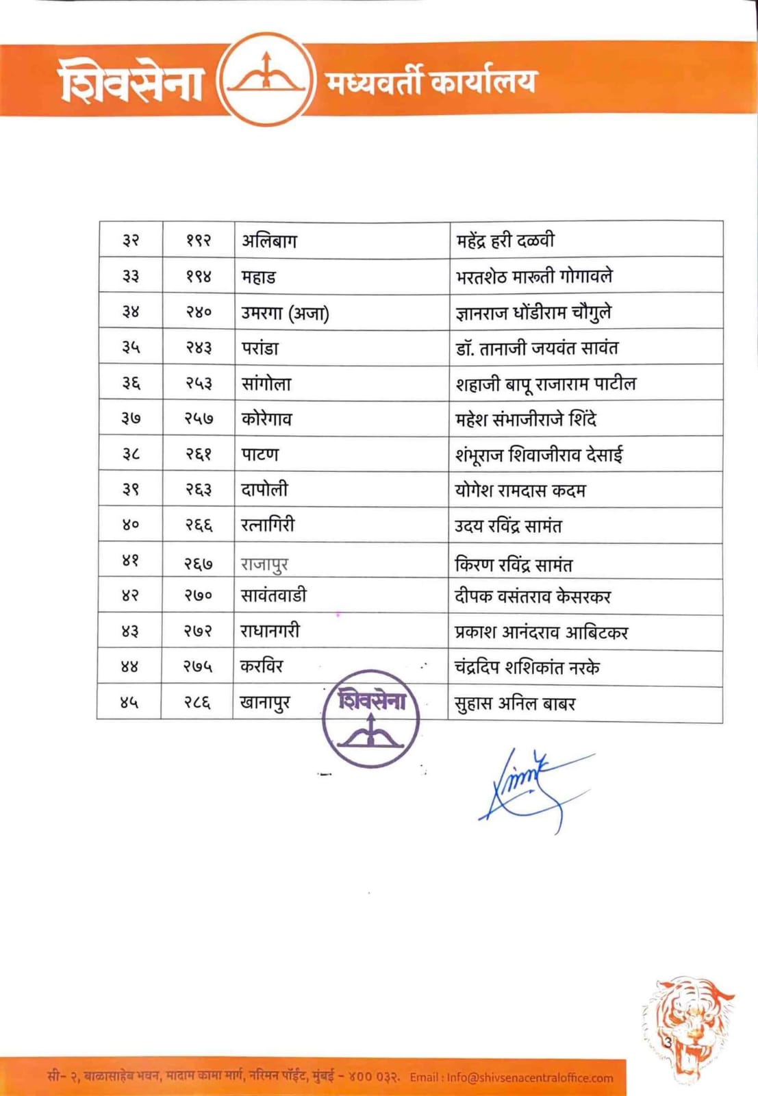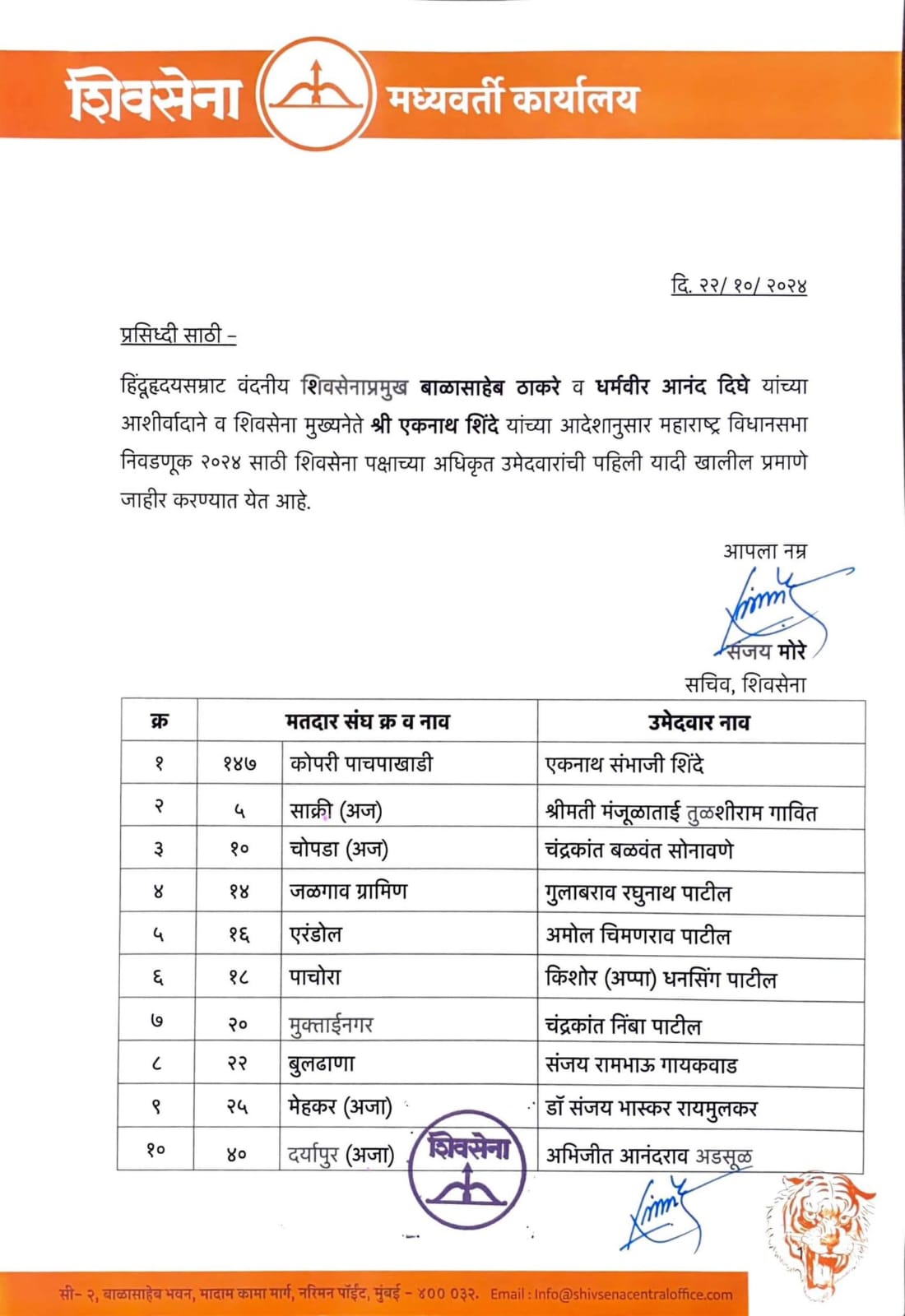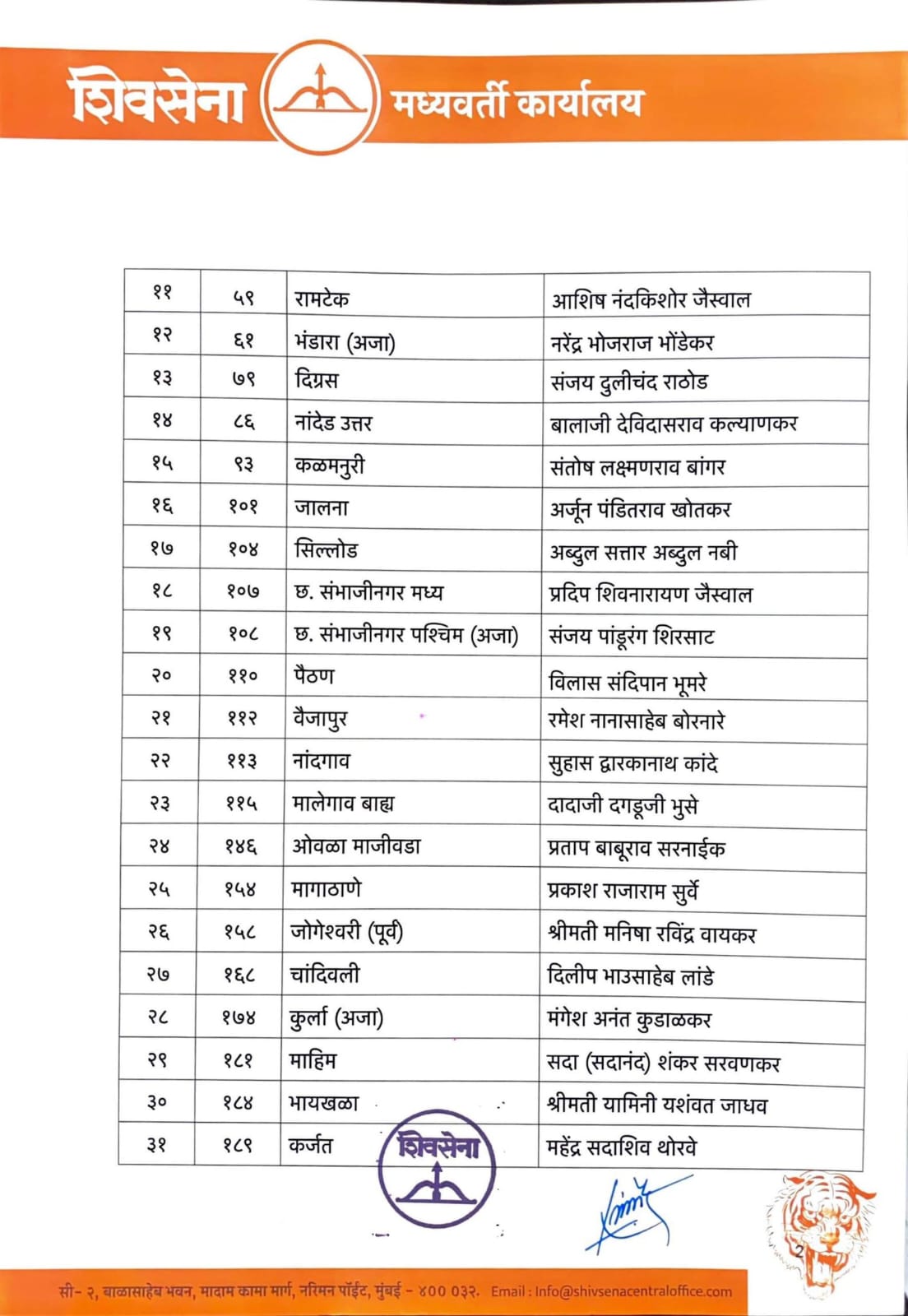 मुख्यमंत्री एकनाथ शिंदे यांच्या शिवसेनेकडून उमेदवारांची पहिली यादी जाहीर करण्यात आली आहे. पहिल्या यादीत 45 जणांना उमेदवारी जाहीर करण्यात आली आहे.