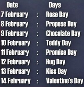 व्हॅलेंटाईन्स डेच्या आधी लोक रोज डे, प्रपोज डे, चॉकलेट डे, टेडी डे, प्रॉमिस डे, हग डे आणि किस डे असे अनेक प्रेमाचे दिवस साजरा करतात. जाणून घेऊयता या वर्षी कधी कोणता ‘डे’ येतो आहे ते