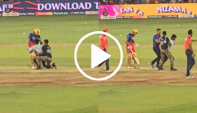 Virat Kohli: रॉयल चॅलेंजर्स बंगळुरु संघाने IPL 2024 मध्ये पंजाब किंग्जचा 4 विकेट्सनी पराभव करून विजयाची नोंद केली आहे. आरसीबीचा कर्णधार फाफ डु प्लेसिसने नाणेफेक जिंकून प्रथम गोलंदाजी करण्याचा निर्णय घेतला. प्रथम फलंदाजी करताना पंजाब किंग्जने 176 धावा केल्या. कोहली आणि दिनेश कार्तिकच्या उत्कृष्ट फलंदाजीच्या जोरावर बंगळुरुने या लक्ष्याचा पाठलाग केला. मात्र सामन्याच्या मध्यावर एक चाहता मैदानात घुसला.