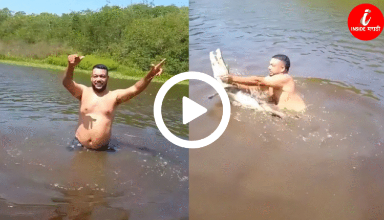 व्हायरल व्हिडिओमध्ये एक तरुण नदीच्या मध्यभागी पाण्यात उतरून आनंद लुटताना दिसत आहे. तो समोर बोटीवर बसलेल्या आपल्या मित्रांकडे पाहून हसतोय आणि चेहऱ्यावर पाणी उडवून मजा करतोय. इतक्यात त्याला त्याच्या पायांजवळ काहीतरी हालचाल जाणवते. सुरुवातीला त्याला वाटते की कदाचित एखादा मोठा मासा असावा. तो मोठ्या उत्साहाने पाण्यात डुबकी मारतो आणि त्या ‘जीवाला’ घट्ट पकडून बाहेर काढतो. पण जेव्हा तो पाण्याबाहेर येतो, तेव्हा त्याच्या हातात मासा नसून एक जिवंत ‘मगर’ असते!